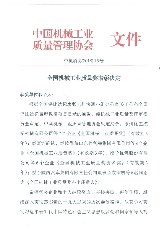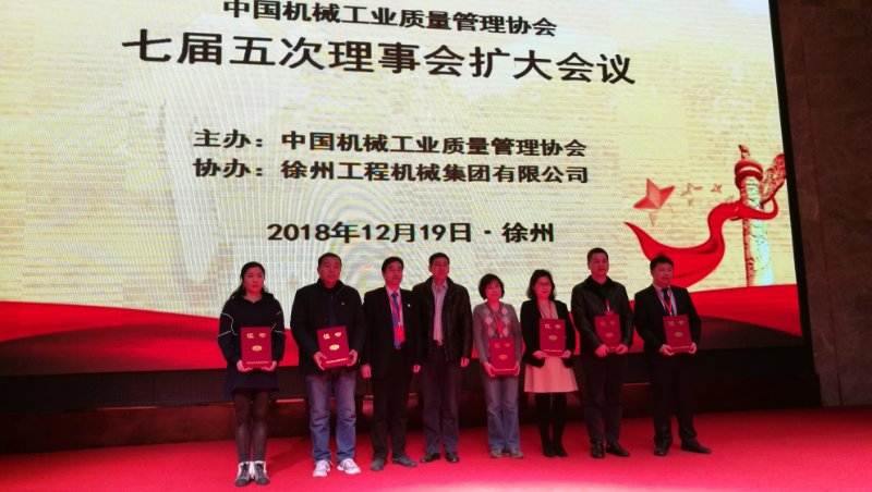 2018年12月19日至20日,中國機械工業(yè)質(zhì)量管理協(xié)會七屆五次理事擴大會議在徐州舉行。會議對在機械工業(yè)質(zhì)量管理中作出優(yōu)異成績的先進企業(yè)和優(yōu)秀個人進行了表彰,公司董事長黃毅同志被授予“全國機械工業(yè)質(zhì)量獎杰出質(zhì)量人”榮譽稱號。